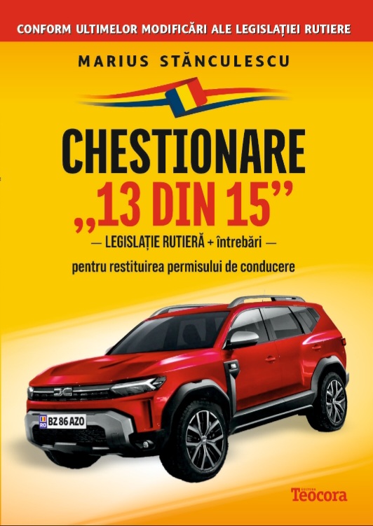 Cartea scrisa de Marius Stanculescu, „Chestionare 13 din 15 – Legislatie rutiera si intrebari pentru restituirea permisului de conducere”, cuprinde notiuni necesare fiecarui conducator auto. De-a lungul timpului, legislatia rutiera a fost modificata de mai multe ori, motiv pentru care conducatorii auto nu cunosc pe deplin toate schimbarile aparute. Prin cartea sa, autorul se adreseaza unui public larg, incluzand persoanele ce doresc sa-si reimprospateze cunostintele, cat si cele ce se axeaza pe aprofundarea informatiilor dobandite anterior. Chestionare 13 din 15 – Legislatie rutiera si intrebari pentru restituirea permisului de conducere este o carte ce se adreseaza tuturor posesorilor de carnet de conducere, nu doar celor ce au ca scop redobandirea acestuia. Autorul reuseste sa-si sintetizeze cunostintele, structurandu-le in carte sub forma unor capitole ce includ notiuni de baza, imagini in scop explicativ, iar la sfarsit sunt introduse chestionarele cu scopul evaluarii informatiilor acumulate anterior.