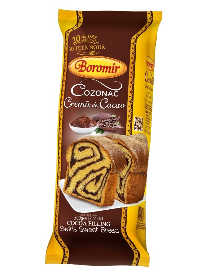 Cozonacul Boromir cu cremă de cacao îmbină perfect aroma de cacao cu gustul delicat al miezului pufos. Preparat din cele mai bune ingrediente în urma fermentării naturale cu maia, cozonacul tradițional Boromir te surprinde cu savoarea sa inconfundabilă. Este un preparat tradițional special conceput pentru a-ți aduce mai aproape gustul autentic românesc al cozonacilor pregătiți cu multă pasiune și dedicare. Descoperă rețeta noastră de savarină reinventată din felii de cozonac însiropate și frișcă din plin, un deliciu rapid și foarte aromat! Găsești pașii de preparare pe blogul nostru, alături de multe alte idei de deserturi inedite din cozonaci: cremă de zahăr ars, tort cu mere caramelizate, frigănele dulci sau french toast cu fructe fresh, budincă de vanilie, plus multe alte rețete pe care le vei adora. În Colecția Boromir găsești și alte sortimente cu umpluturi bogate și delicioase care să-ți îndulcească zilele.