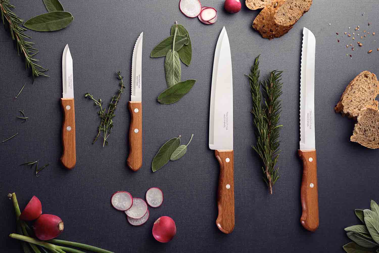 Cu manere din lemn natural atasate cu nituri din aluminiu, vesela Dynamic adauga o nota rustica meselor dumneavoastra.
