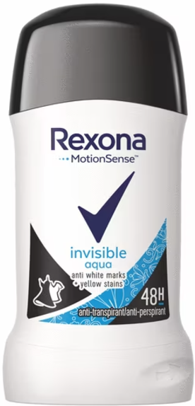 Antiperspirantul stick Rexona Invisible Aqua iti ofera protectie eficienta impotriva transpiratiei si minimizeaza aparitia urmelor albe si galbene pe haine.