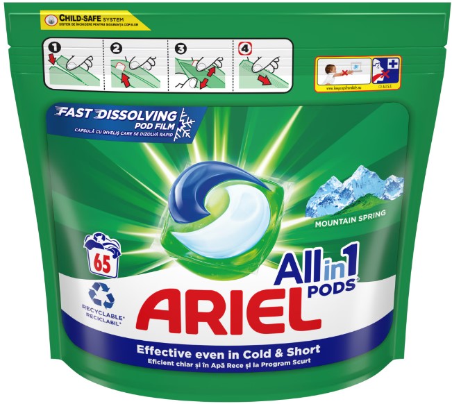 Detergent de rufe capsule 65 spalari, Ariel - All In One Pods Mountain Spring