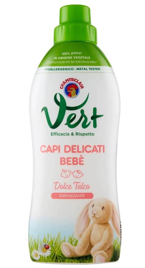 Chanteclair Vert a creat o linie speciala, pentru hainutele bebelusilor, de eco detergenti de inalta performanta cu un impact redus asupra mediului. Linia de produse Chanteclair Vert este certificata 100% BIO si garanteaza calitatea si veridicitatea caracteristicilor de mediu. Acest ecodetergent nu este testat pe animale, are o formula fara coloranti si fosfati, testat Nichel Mercur Plumb Cobalt Crom. Tensioactivi surfactanti din surse regenerabile si durabile. Ambalaj reciclabil 100%. Aprobat de Derming Dermatological Institute. Hipoalergenic - Testat metalic, Surfactantii prezenti in produs sunt lejeri, rapid, complet biodegradabili. (conform Regulamentului CE 648/2004 si modificarile ulterioare). Ingrediente 100% active de origine vegetala complet biodegradabil. Igienizant. Pentru dozaj, consultati ambalajul. Se sorteaza rufele, se dozeaza in functie de duritatea apei si murdaria rufelor apoi se introduce gradatia in cuva masinii de spalat. Respectati avertizarile referitoare la detergenti / produse chimice. Utilizati doar pentru scopul destinat.Specificatii