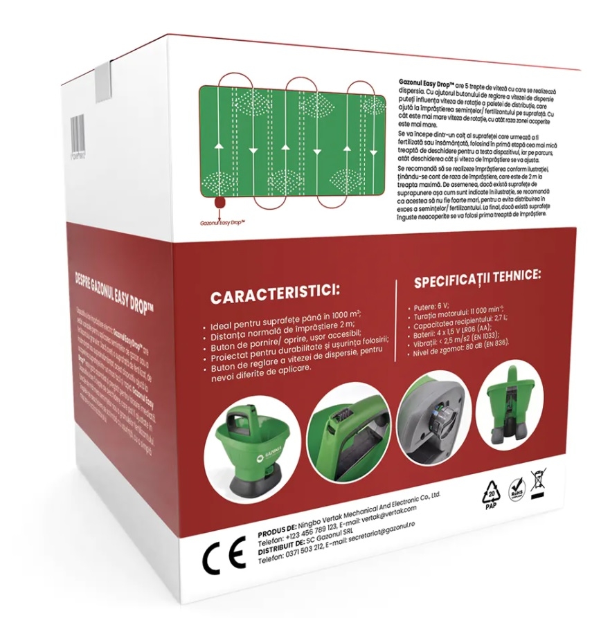 Dispozitivul electric de imprastiere seminte si fertilizant Gazonul™ Easy-Drop este un dispozitiv care se incadreaza la categoria hobby si este recomandat persoanelor care au de insamantat sau fertilizat suprafete de pana la 1000 m2. .