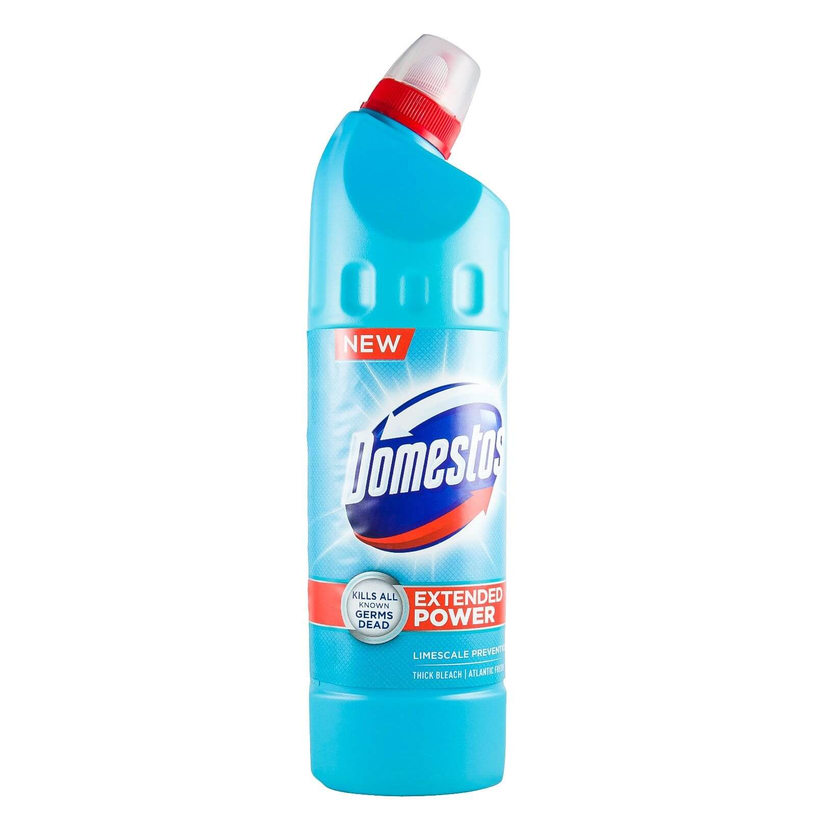 Domestos dezinfectant inalbitor lichid - omoara toti microbii cunoscuti. Folosit zilnic, Domestos Extended Power Atlantic Fresh este o generatie noua de dezinfectant inalbitor cu molecule active ANTI-CALCAR care adera peretii vasului de toaleta si previne depunerile de calcar, astfel te protejeaza pe tine si familia ta de pericolul raspandirii microbilor din toaleta pentru intreaga zi.