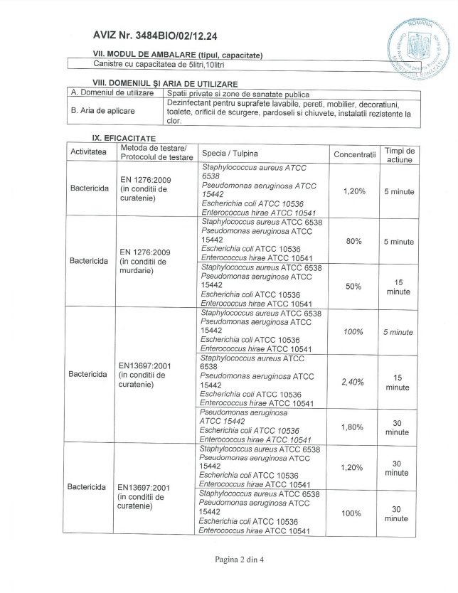 Proprietati de baza si avantaje – Clor activ: efect biocid cu spectru larg – distruge eficient bacterii, virusi si mucegaiuri elimina mirosurile neplacute prin distrugerea chimica a sursei acestora