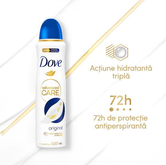 Antiperspirantul spray Dove Original ofera pana la 48 de ore de protectie eficienta impotriva transpiratie si ingrijire superioara,