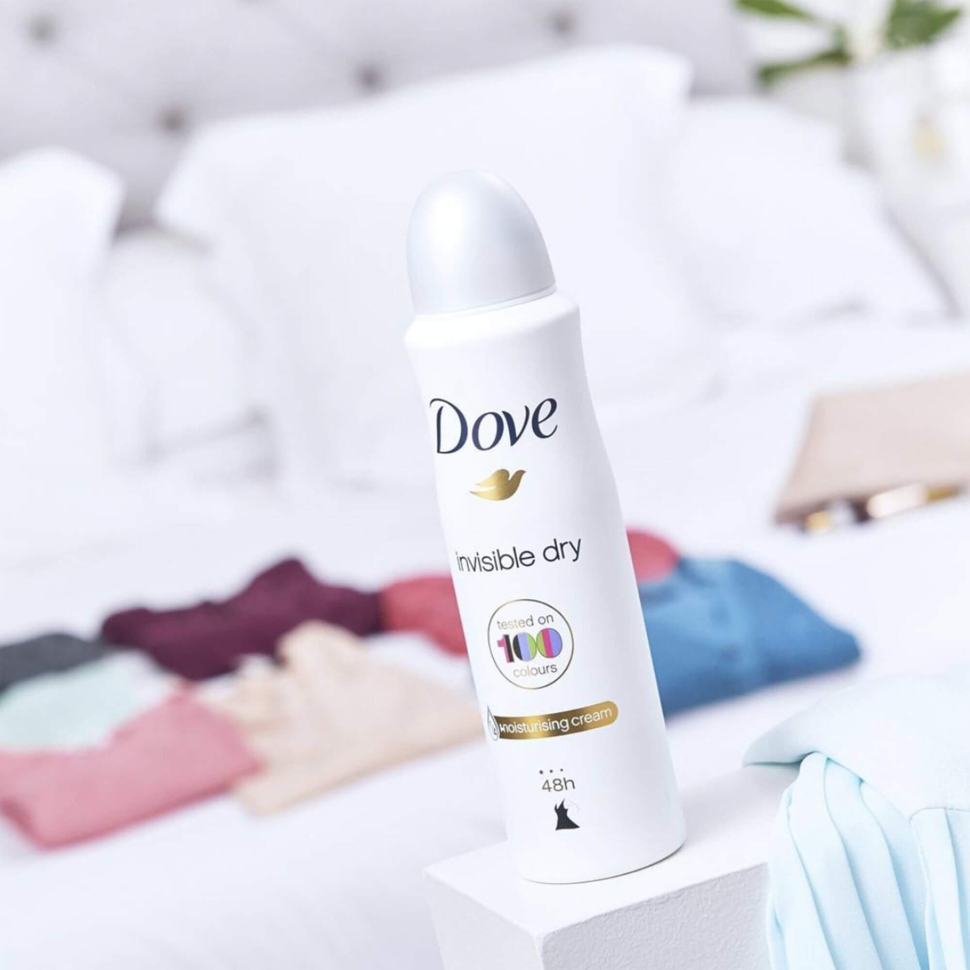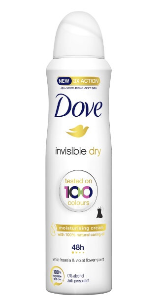 Evita urmele albe de deodorant cu antiperspirantul spray Dove Invisible Dry, testat pe 100 de culori.