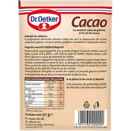 Cacao Dr. Oetker confera un gust si un aspect aparte prajiturilor, torturilor si bauturilor. Se poate adauga in creme, glazuri, aluaturi pentru prajituri, bauturi calde sau reci.