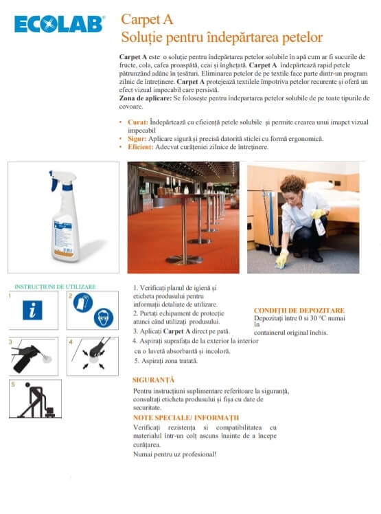 Carpet A este o soluție pentru îndepărtarea petelor solubile în apă cum ar fi sucurile de fructe, cola, cafea proaspătă, ceai și înghețată. Carpet A îndepărtează rapid petele