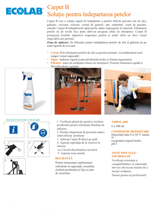 Carpet B îndepărtează rapid petele adânc impregnate în material. Eliminarea petelor de pe textile face parte dintr-un program zilnic de întreținere.