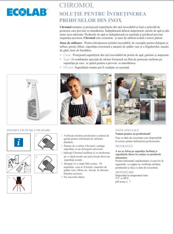 urme usor aderente. Picăturile de apă se îndepărtează cu ușurință și produsul previne reapariția acestora. Chromol este economic și ușor de utilizat având o miros plăcut .