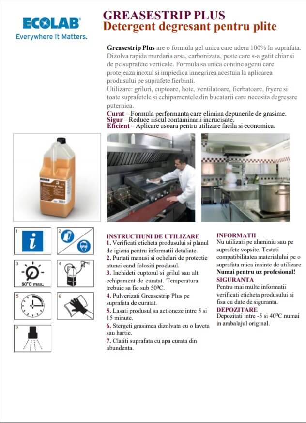 Greasestrip Plus are o formula gel unica care adera 100% la suprafata. Dizolva rapida murdaria arsa, carbonizata, peste care s-a gatit chiar si de pe suprafete verticale. Formula sa unica contine agenti care protejeaza inoxul si impiedica innegrirea acestuia la aplicarea produsului pe suprafete fierbinti.
