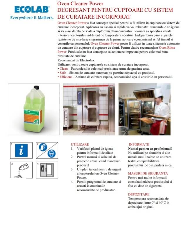 Poate fi utilizat in toate sistemele automate de curatare din cuptoare si cuptoare cu aburi. Pentru clatire recomandam Oven Rinse Power. Produsele au fost concepute sa actioneze impreuna pentru cele mai bune rezultate de curatare.