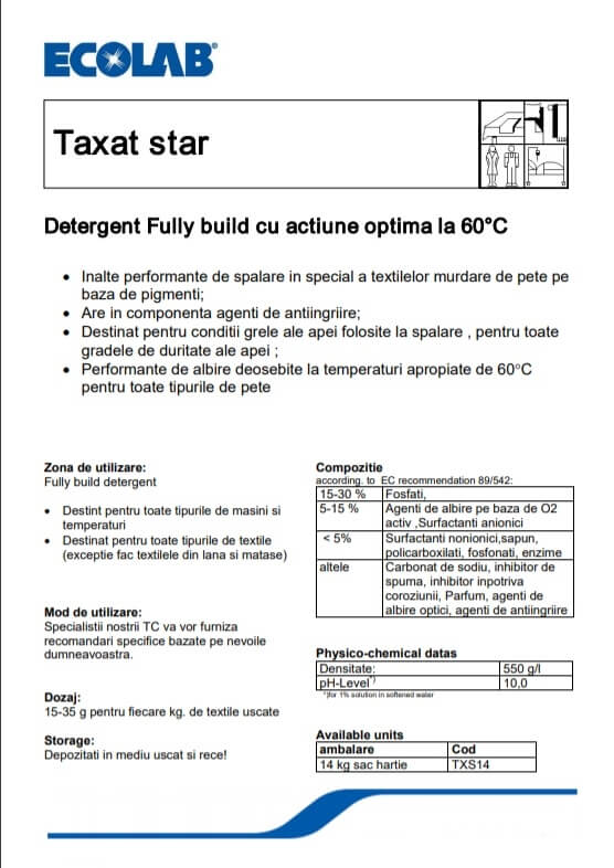 Ecolab Taxat Star Detergent pentru haine/rufe universal, 14 Kg