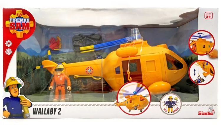 Pompierul Sam elicopter Wallaby este un set mare datorita caruia copilul poate juca rolul unui erou curajos gata sa ajute pe oricine are nevoie. Functii de lumini si sunete. Setul contine 1 elicopter Wallaby 1 figurina Tom 1 casca de pilot 1 cos 1 targa 1 prindere de franghie 1 walkie-talkie 1 topor 1 ciocan 1 trusa de prim ajutor 1 stingator baterii necesare 3.Specificatii