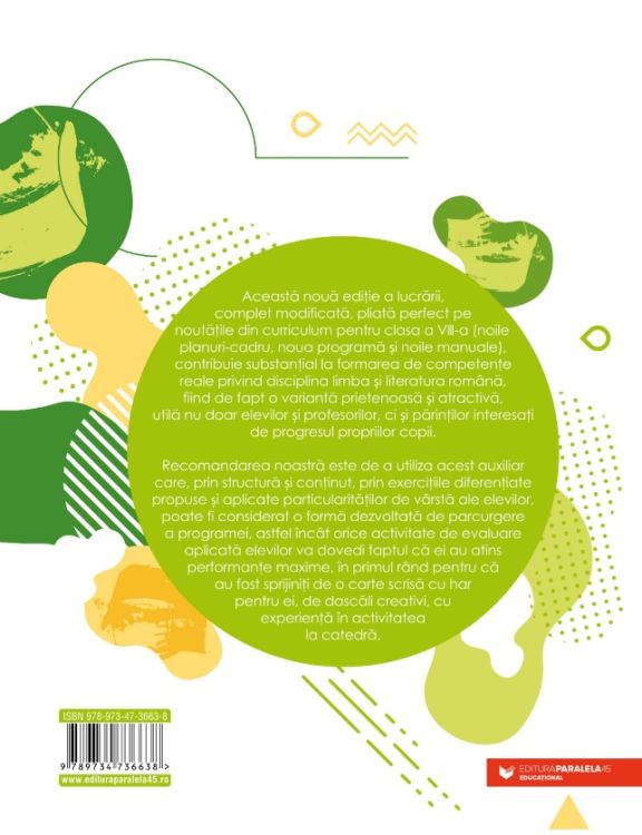Avizat M. E. C. conform O. M. nr. 5318 21. 11. 2019 Lucrarea se pliaza perfect pe noutatile din curriculum pentru clasa a VIII-a noile planuri cadru noua programa si noile manuale si contribuie substantial la formarea de competente reale privind disciplina limba si literatura romana fiind de fapt o varianta prietenoasa si atractiva utila nu doar elevilor si profesorilor ci si parintilor interesati de progresul propriilor copii. Recomandarea noastra este de a utiliza acest auxiliar care prin structura si continut prin exercitiile diferentiate propuse si aplicate particularitatilor de varsta ale elevilor poate fi considerat o forma dezvoltata de parcurgere a programei astfel incat orice activitate de evaluare aplicata elevilor va dovedi faptul ca ei au atins performante maxime in primul rand pentru ca au fost sprijiniti de o carte scrisa cu har pentru ei de dascali creativi cu experienta in activitatea la catedra.