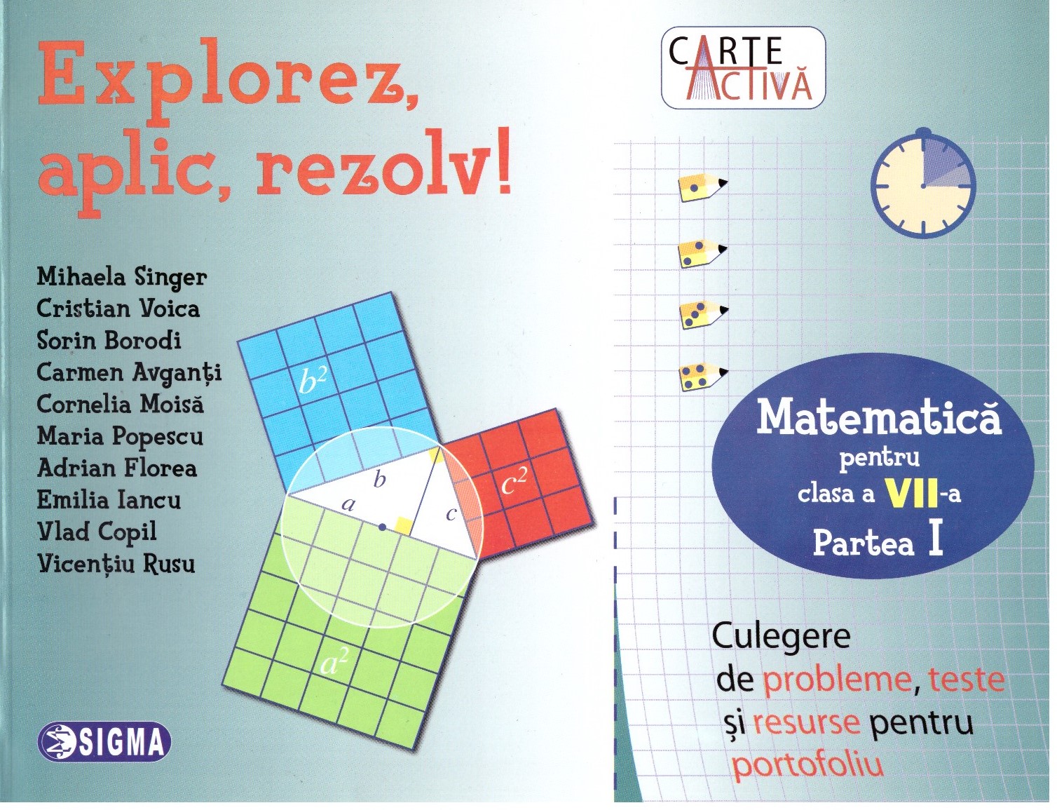 Culegerea de probleme de matematica Explorez, Aplic, Rezolv! din colectia Carte Activa parcurge foaie cu foaie, ora de ora, toata materia din programa de matematica a clasei a VII-a. Folosind aceasta culegere in ora de predare, profesorii pot oferi elevilor sa rezolve teste scurte (de 10-15 minute), dar esentiale pentru a verifica nivelul la care acestia au inteles lectia. Astfel, culegerea reuseste sa fie cel mai eficient instrument de predare-invatare-evaluare, elevii ajungand sa exerseze, sa-si verifice si sa-si dezvolte aproape concomitent competentele prevazute de programa scolara.