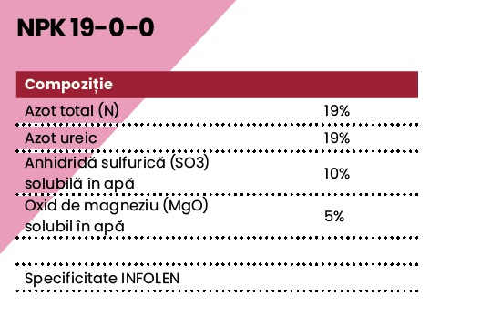 Azot total (N) – 19%, Azot ureic – 19%, Anhidridă sulfurică (SO3) solubilă în apă – 10%, Oxid de magneziu (MgO) solubil în apă – 5%.