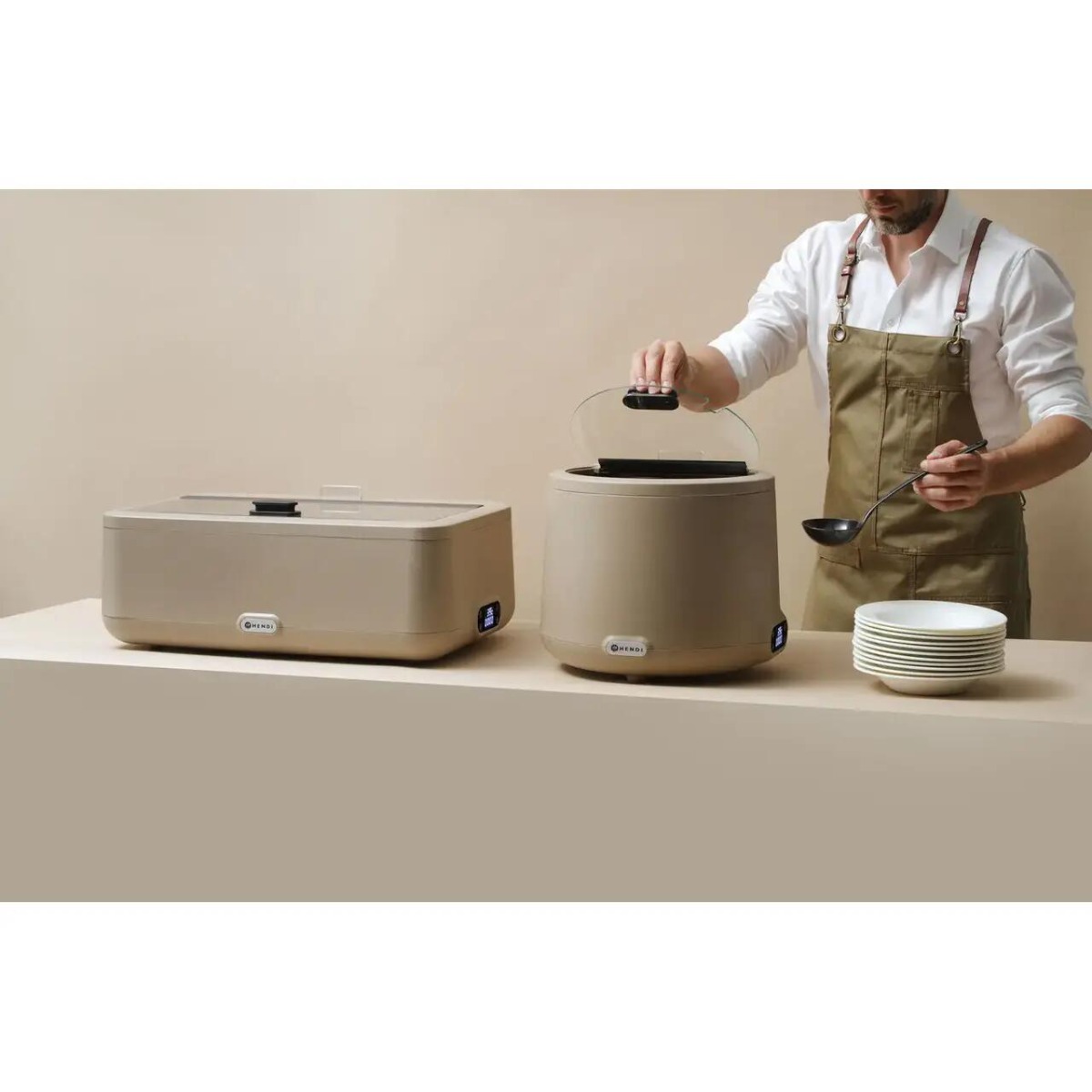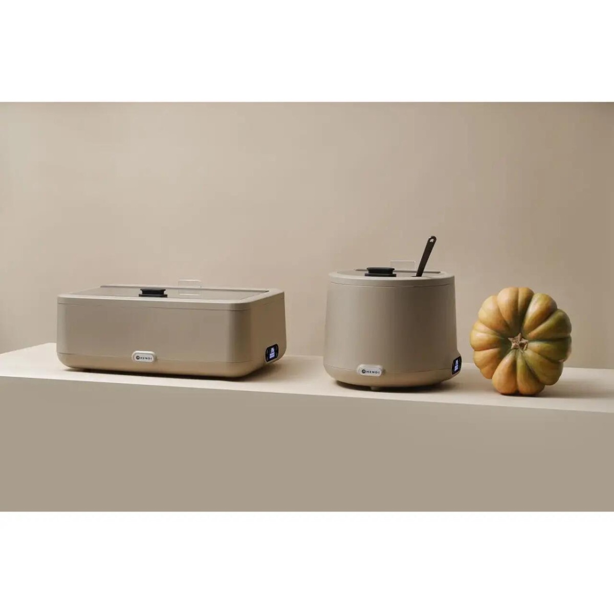 HENDI UNIQ a fost proiectat de renumitul designer olandez Robert Bronwasser si este disponibil in 3 culori elegante. Dispozitivul are o carcasa moderna si se distinge prin mai multe functii neobisnuite. Se retine ultima temperatura de incalzire setata. Doar conectati-l, umpleti recipientul cu apa, iar fierbatorul va mentine supa la o temperatura constanta, ideala de servire.