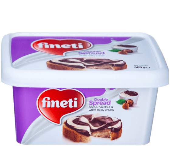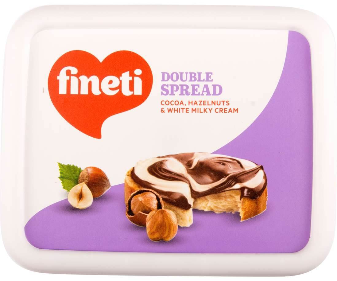 Crema de ciocolata bicolora tartinabila cu alune de padure si crema alba de lapte.