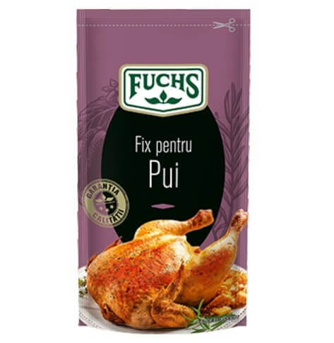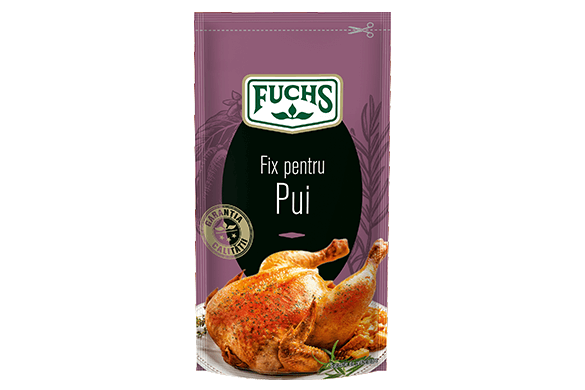 Aveți nevoie de: 1 plic de Fix pentru Pui, 1 kg de carne de pui, 5 linguri de ulei. Amestecați conținutul acestui plic cu cinci linguri de ulei, așezați bucățile de pui într-o tavă și adăugați apă. Adăugați compoziția obținută din ulei și condimente peste carne și puneți tava la cuptor. Lăsați să se coacă până când puiul devine fraged și capătă o culoarea aurie.