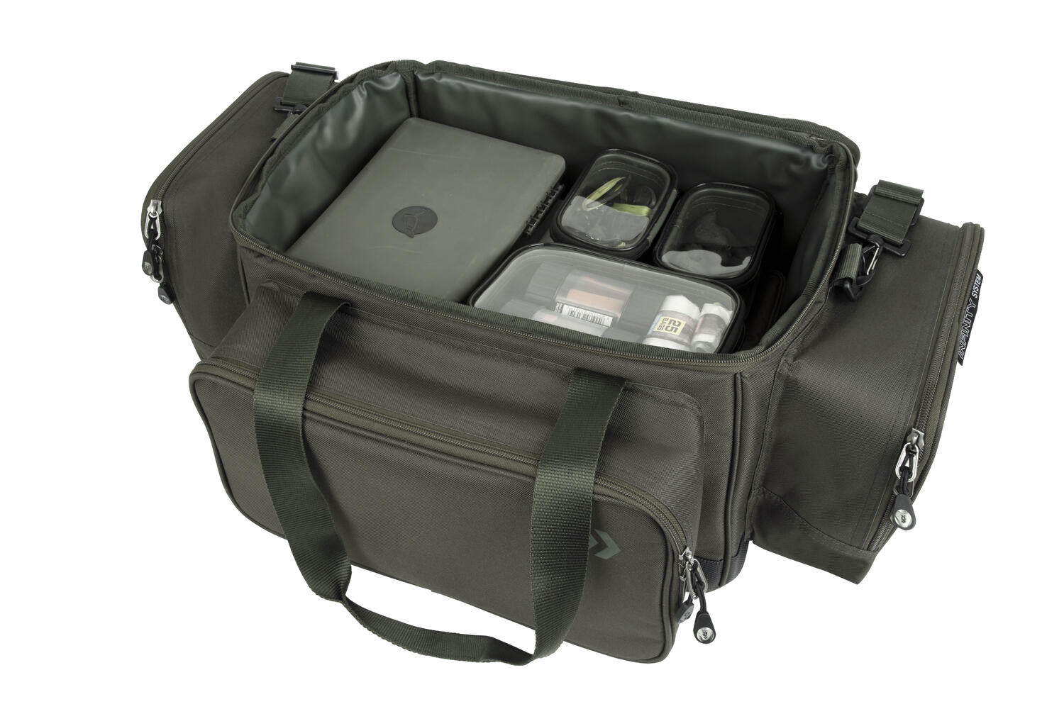 Geanta IS (Infinity System) Low Level Carryall este proiectata pentru a fi utilizata ca geanta principala de depozitare. Cele mai populare modele de cutii de accesorii incap perfect in aceasta geanta, fiind compatibila cu o gama larga de cutii de dimensiuni mai mici. Geanta este echipata cu un capac rigid, ce poate servi si ca masa pentru pregatirea monturilor, sau pentru a mentine in siguranta accesoriile mici la indemana. Captuseala interioara din PVC este usor de curatat, iar baza rigida din PVC protejeaza impotriva umezelii. Pe exterior geanta este dotata cu trei buzunare pentru accesorii (suport, senzori, etc). Compartimentul interior dispune de un design ce permite depozitarea a patru genti medii pentru accesorii sau doua genti mai mari cooler.