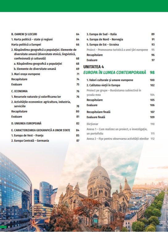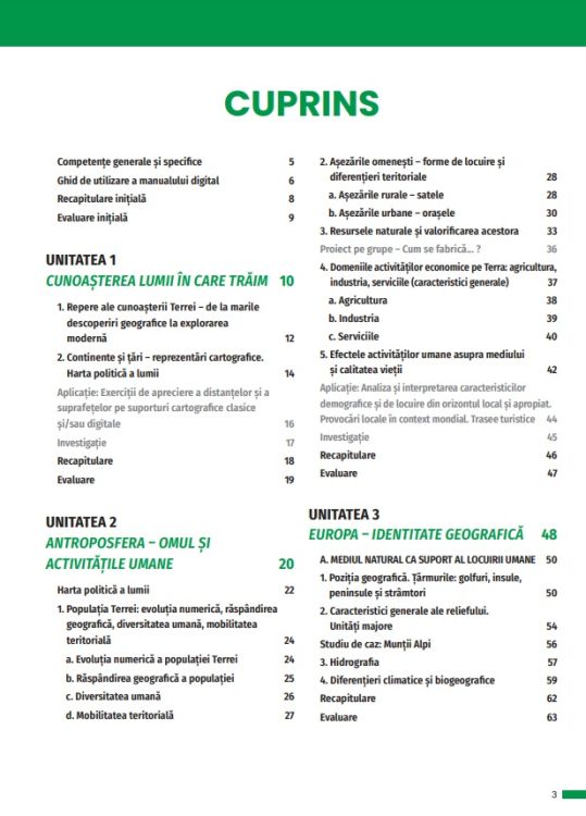Conceput pe baza programei scolare pentru invatamantul gimnazial manualul este structurat in patru unitati. Fiecare unitate contine toate domeniile de continut ale programei scolare sectiuni teoretice care structureaza informatiile material cartografic grafic si imagistic bogat si variat activitati de invatare activ-participative aplicatii si investigatii prin care elevii pot folosi in situatii reale de viata cunostintele dobandite sectiuni de recapitulare si evaluare metode complementare de evaluare observarea sistematica a activitatii si comportamentului elevului investigatia proiectul portofoliul autoevaluarea . Fiecare lectie este structurata pe urmatoarele sectiuni Observa in care atentia elevilor este captata prin exercitii care sa ii ajute sa intuiasca si sa descopere treptat notiunile care urmeaza sa fie invatate si aprofundate in lectie Invata in care sunt prezentate notiunile teoretice propriu-zise structurate astfel incat sa permita o invatare facila Aprofundeaza aceasta are drept scop fixarea notiunilor insusite precum si evidentierea unor aspecte particulare despre tema lectiei Exerseaza aici elevii isi pot testa notiunile cunostintele dobandite. Varianta digitala a manualului reproduce varianta tiparita si cuprinde in plus o serie de activitati multimedia de invatare intr-o maniera interactiva. Manualul se numara printre castigatoarele licitatiei organizate de Ministerul Educatiei cu nota 99 20.Specificatii