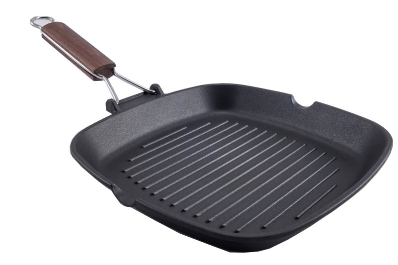 Gratar teflonat cu suprafata striata si maner pliabil din lemn, dimensiuni(Lxlxh mm):260x260x35