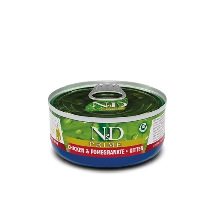 Conserva N&D Prime Kitten cu Pui si Rodie, 70 g este o hrana umeda completa pentru puii de pisica si femele gestante sau care alapteaza.