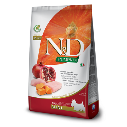 N&D Grain Free Adult Mini - Pui, Dovleac si Rodie este o hrana uscata fara cereale de la Farmina, recomandata cainilor adulti de talie mica sau talie pitica. Formula nutritionala pe baza de carne de pui este o sursa importanta de proteine, vitamine, minerale si substante nutritive. Antioxidantii din mar, dovleac si rosie sunt benefici in sustinerea sistemului imunitar si a starii de bine a patrupedului. Acest tip de hrana uscata este usor digerabila iar gustul aromat si delicios de carne de pui si legume va fi pe placul si celui mai prerentios caine. N&D Grain Free Adult Mini - Pui, Dovleac si Rodie nu contine cereale, fiind o hrana uscata perfecta pentru cainii cu sensibilitate digestiva.