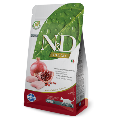 N&D Prime Cat Adult cu Pui si Rodie, 10 Kg este o hrana uscata Super Premium marca Farmina, fara cereale pentru pisici adulte.