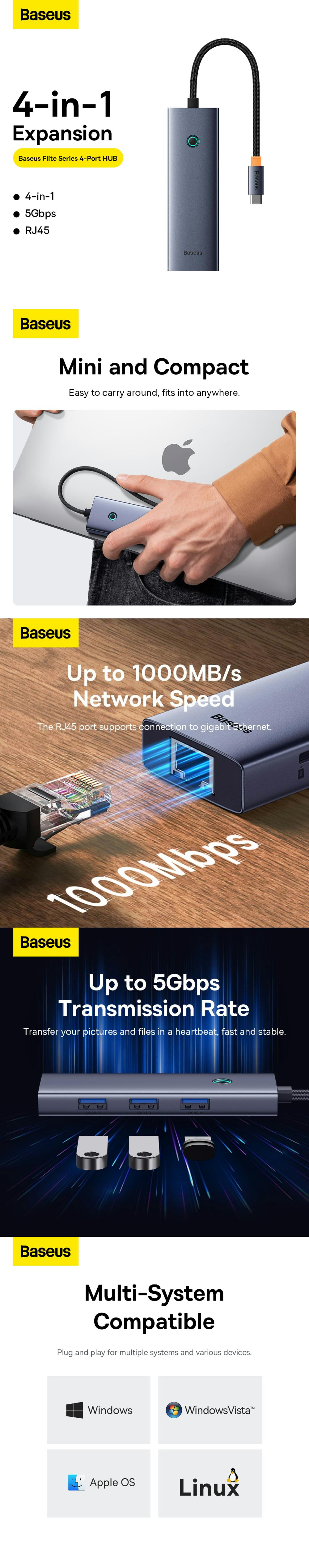 Hub-ul Baseus UltraJoy 4 in 1 dispune de 3 porturi USB 3.0 care permit transferul de date la viteze de pana la 5 Gbps. De asemenea, are un conector RJ45 care suporta viteze de pana la 1.000 Mbps. Functioneaza cu o gama larga de dispozitive si, datorita designului sau compact, il puteti pastra mereu la indemana.