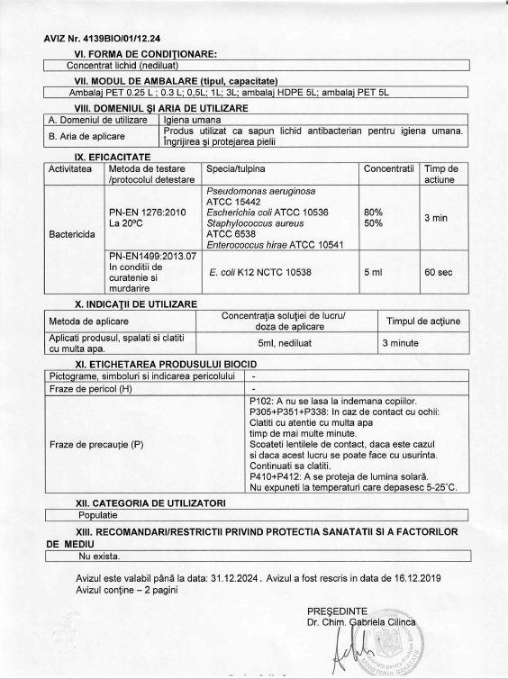 Mod de utilizare: Produsul se aplica nediluat 5 ml, se spala timp de 3 minute pentru activitate bactericida si se clateste cu multa apa. Prezinta efect bactericid ( Pseudomonas hirae, Pseudomonas aeruginosa, Escherichia coli, Stafilococcus aureus, Enterococus hirae) conform EN 1276 si asupra Ecoli conform EN 1499