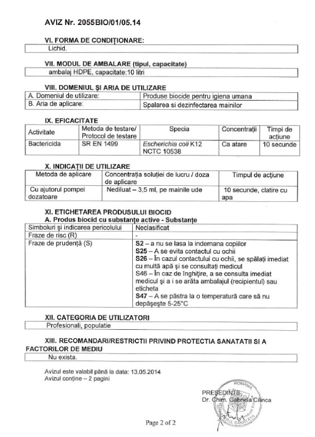 Utilizare: Produsul se aplica cu ajutorul unei pompe dozatoare. Produsul nu se diliueaza, se utilizeaza in concetrantie originala.
