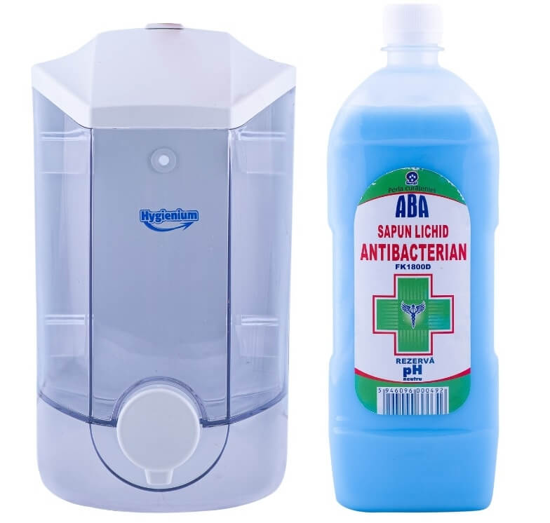 Hygienium Dispenser/Dozator manual pentru sapun, 1000 ml + Aba Biocid Sapun dezinfectant rezerva 1000 ml, avizat Ministerul Sanatatii