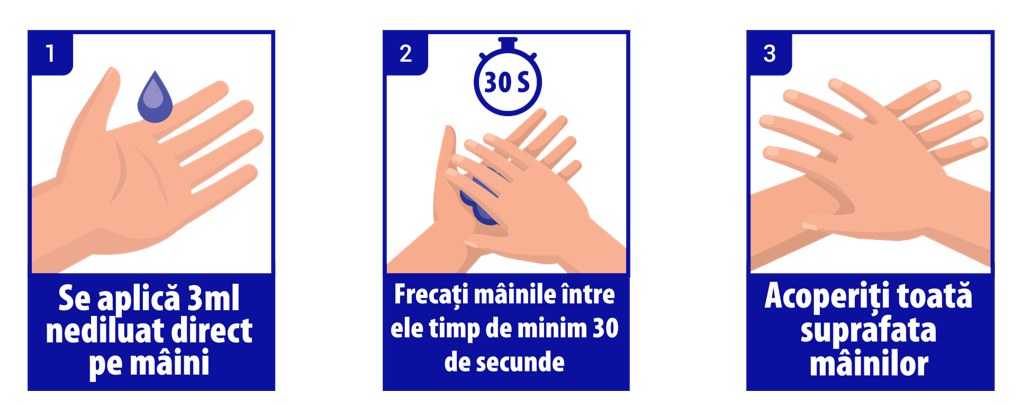 Mod de utilizare: se aplica in palma 3 ml de produs si se freaca mainile 30 de secunde pana la uscarea completa.