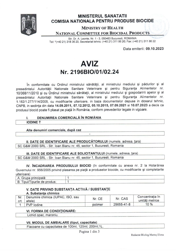 Dezinfectant si antiseptic Biocid pentru igiena umana 1L, Iodine T