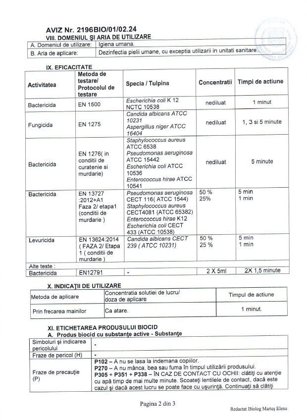 Bactericid conform EN 1500 la 1 minut si conform EN 1276 in conditii de curatenie si murdariela 5 min.