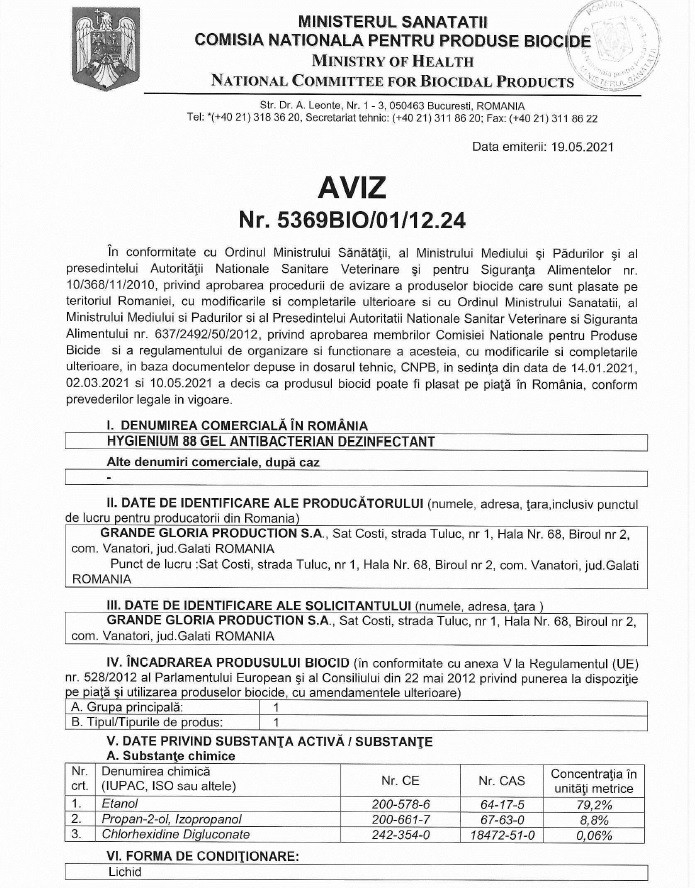 Denumire produs: Hygienium 88 Gel antibacterian dezinfectant