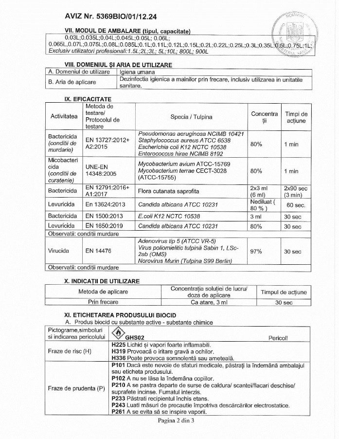 Igiena umana. Este utilizat pentru dezinfectia igienica a mainilor. Prezinta efect bactericid asupra Pseudomonas aeruginosa, Staphylococcus eureus, Escherichia coli K12, Enterococcus hirae conform EN 13727 si asupra E. coli conform PN EN 1500, efect levuricid asupra Candida albicans conform EN 1650 si conform EN 13624 , efect virucid asupra virusilor necapsulati: ADN Adenovirus tip 5, ARN Virus poliomelitic tulpina Sabin 1, ARN Norovirus Murin/MNV (virusul Norwalk), Rotavirus eficienta dovedita impotriva virusilor incapsulati: Modified Vaccinia Ankara virus/MVA, SARS-CoV-2 (MERS-CoV) ,AH1N1, AH2N2, AH3N2, Rabie, Ebola conform EN 14476 efect tuberculocid asupra Mycobacterium avium, Mycobacterium terrae conform EN 14348 si efect bactericid pentru flora cutanata saprofita conform EN 12791. Nu necesita folosirea apei si a sapunului, facandu-l ideal de utilizat pentru dezinfectia igienia a mainilor atunci cand spalarea acestora nu este posibila.