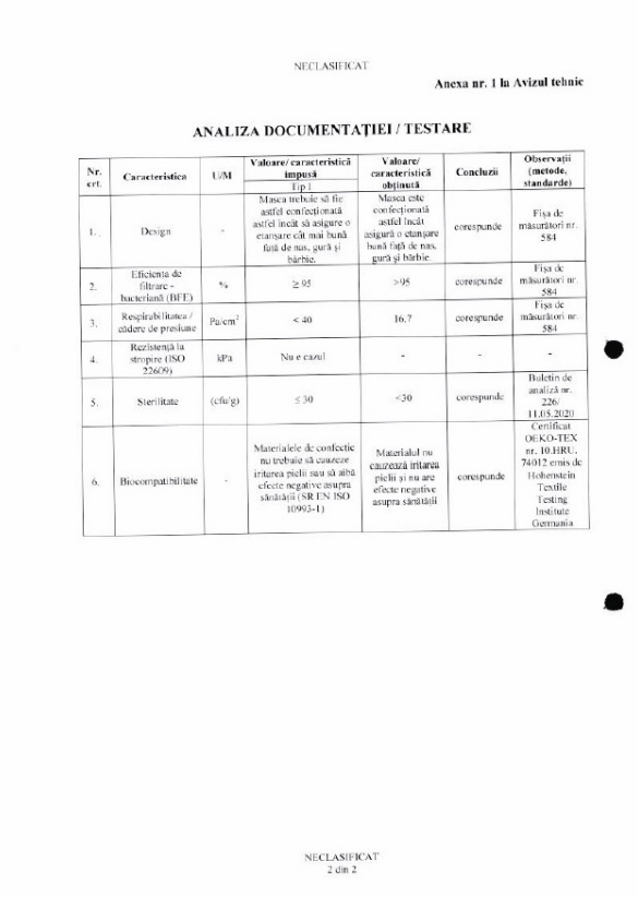 - Respirabilitate (presiune diferențială) < 40 [Pa/cm2]