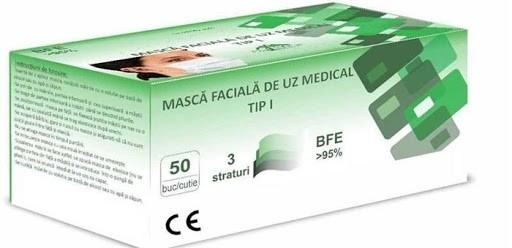 Masca medicala tip 1, conform standardului SR EN 14683, asigura o protectie eficienta impotriva tranferului de microorganisme si bacterii si pentru utilizarea generala de catre persoanele expuse la particule de praf sau alergeni.