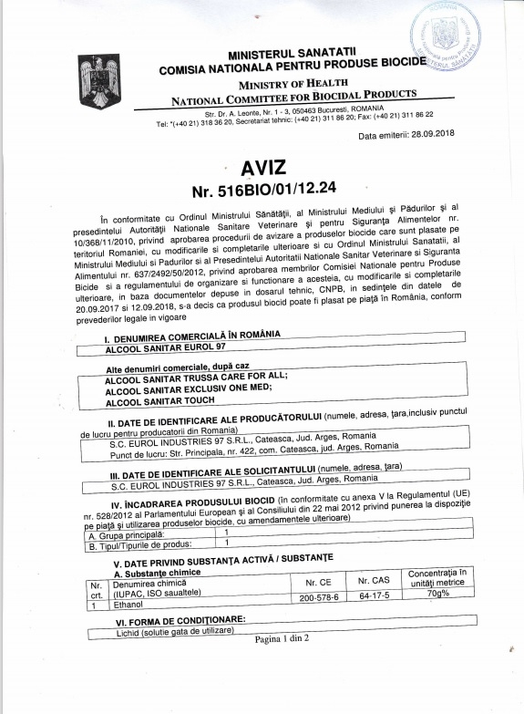Produs biocid din grupa I principala, tip 1, cu activitate bactericida si fungicida, folosit pentru dezinfectia igienica a mainilor prin frecare.