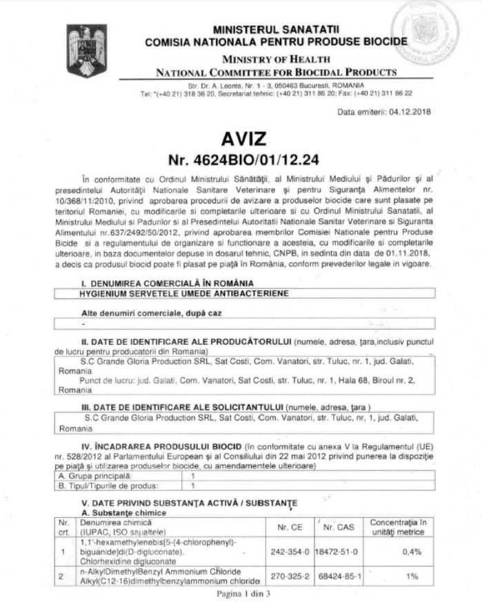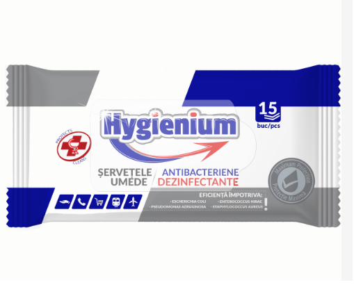Hygienium Servetele umede antibacteriene/dezinfectante 15 buc, avizat Ministerul Sanatatii.