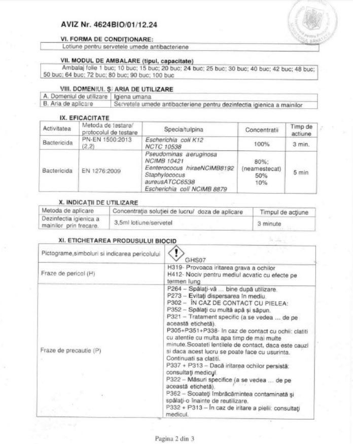Instructiuni de utilizare: Eliberati sigiliul usor si scoateti servetelul. Inchideti dupa fiecare utilizare pentru a mentine nivelul de umiditate.