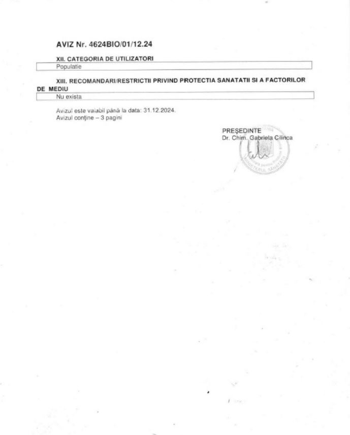 Precautii: Spalati-va bine dupa utilizare. Evitati dispersarea in mediu. In caz de contact cu pielea, spalati cu multa apa si sapun.