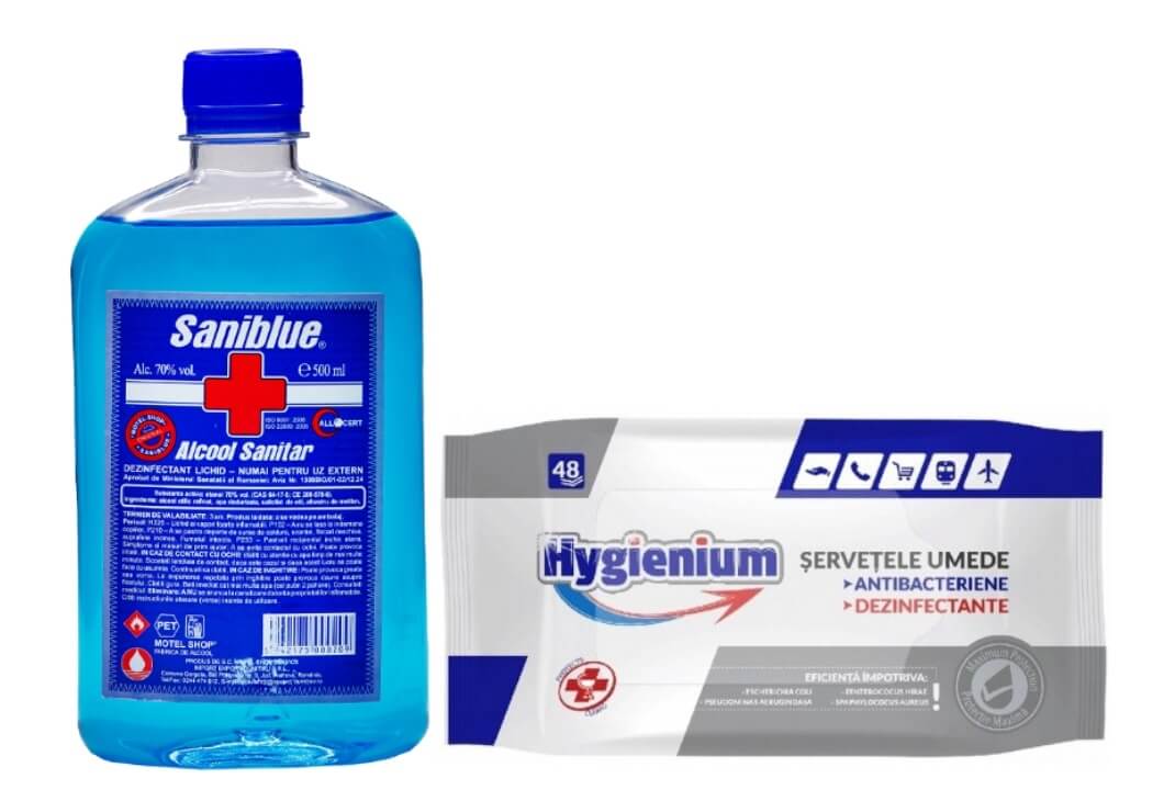 Pachet Saniblue Spirt/ Alcool Sanitar 70%, 500 ml si Hygienium Servetele Umede Dezinfectante Biocid 48 buc, avizat Ministerul Sanatatii