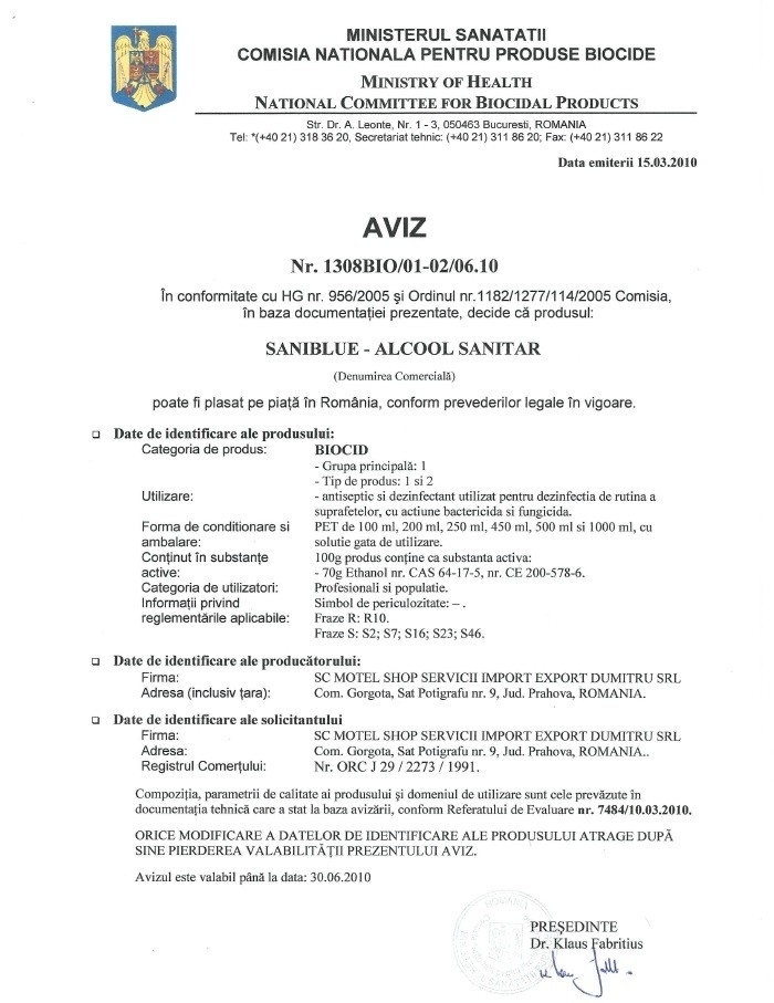 Ingrediente: alcool etilic rafinat, apa dedurizata, salicilat de etil, albastru de metilen.