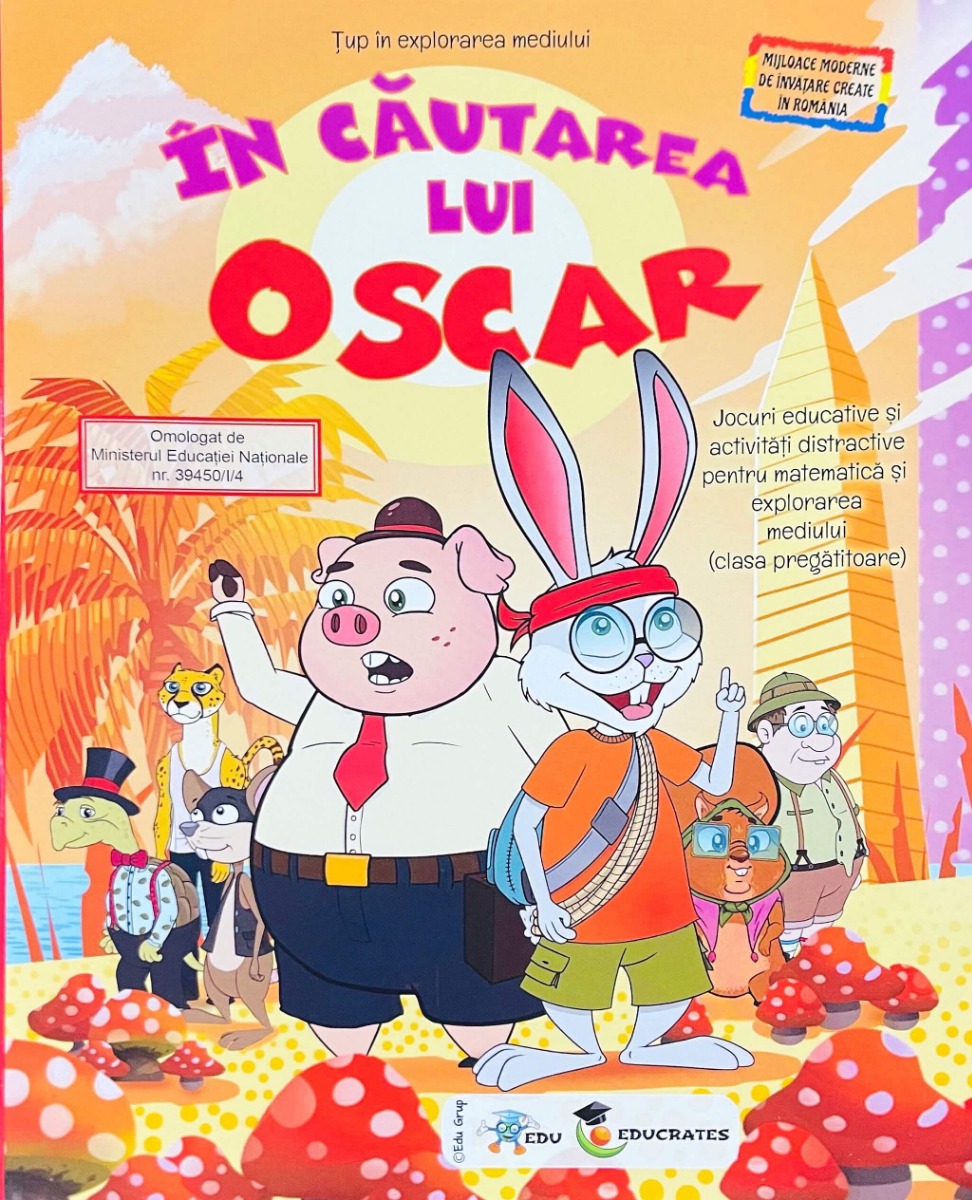 Te vei prapadi de ras cand vei vedea prin ce aventuri vei trece „In cautarea lui Oscar” (matematica si explorarea mediului pentru clasa pregatitoare). Pachetul contine o aplicatie digitala (cu 24 de jocuri edu-distractive si 25 de animatii) si o revista plina de activitati educative (64 de pagini color). Intreg continutul educational ruleaza pe Windows si Android (versiunea minima 4. 4) si poate fi vizualizat GRATUIT introducand codul de acces din revista. Fara voia lui, Pogo, un purcelus elegant, grasut, comod si cam zgarcit, va face echipa cu Tup, un iepuras curios, dornic sa exploreze lumea si sa-l intalneasca pe Oscar, varul sau. Te vei distra impreuna cu ei si vei descoperi secretele matematicii si ale explorarii mediului. Cei doi se vor rataci prin padure, se vor intalni la campie cu Marele Negrila, un soarece care se viseaza mare actor, apoi vor porni intr-o cursa spectaculoasa cu campionul vitezei, ghepardul Feli. Situatiile comice si pline de neprevazut se tin scai de cei doi prieteni care intra dintr-o confuzie in alta. Asa ajung sa il cunoasca pe Oscar Stiintescu, un cercetator cam stangaci si pe Pogos, o testoasa eleganta si sofisitcata. Toata aventura are un final neasteptat: oare il vor gasi pe adevaratul Oscar? CUPRINS Capitolul 1: Rataciti prin padure Matematica: Orientare spatiala si localizari in spatiu (in, pe, deasupra, dedesubt, langa, in fata, in spatele, sus, jos, stanga, dreapta, orizontal, vertical, oblic). Ordonarea nr. 0-10 Explorarea mediului: Plante (parti componente, conditii de viata - apa, aer, lumina, caldura) Capitolul 2: O intalnire cu bucluc Matematica: Compararea nr. 0-10 Explorarea mediului: Animale (parti componente, hrana) Capitolul 3: Campionul vitezei Matematica: Adunarea si scaderea in concentrul 0-10 (cu 1-5 unitati) Explorarea mediului: Animale (conditii de viata - apa, aer, lumina, caldura) Capitolul 4: Dintr-o confuzie in alta Matematica: Lungime (unitati nonstandard) Explorarea mediului: Corpul omenesc (parti componente si rolul lor) Capitolul 5: O petrecere prea sofisticata Matematica: Timp: Zilele saptamanii. Anotimpurile (denumire, ordonare). Lunile anului (denumire, ordonare) Explorarea mediului: Igiena corpului. Hrana ca sursa de energie - igiena alimentatiei Capitolul 6: Un final neasteptat Matematica: Bani - leul (bancnote de 1 leu, 5 lei, 10 lei) Explorarea mediului: SimturileSpecificatii