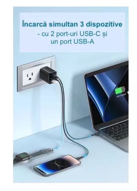 Iesire Port unic: USB-C 1 (67W Max), USB-A (22.5W Max); 2 porturi: USB-C + USB-C: 45 W + 22 W (max. 67 W); USB-C + USB-A: 49 W + 18 W (max. 67 W) ;USB-C + USB-A: 12 W + 12 W (max. 24 W); 3 porturi 42 W + 12 W + 12 W (max. 66 W in total) Putere maxima totala de i